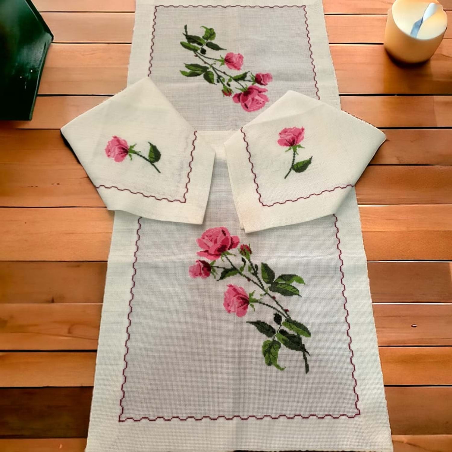 El işlemesi yatak odası takımı. Kumaş linen etamin, ipler muline ipliktir.Kanaviçe işleme tekniği kullanılarak işlenmiştir.